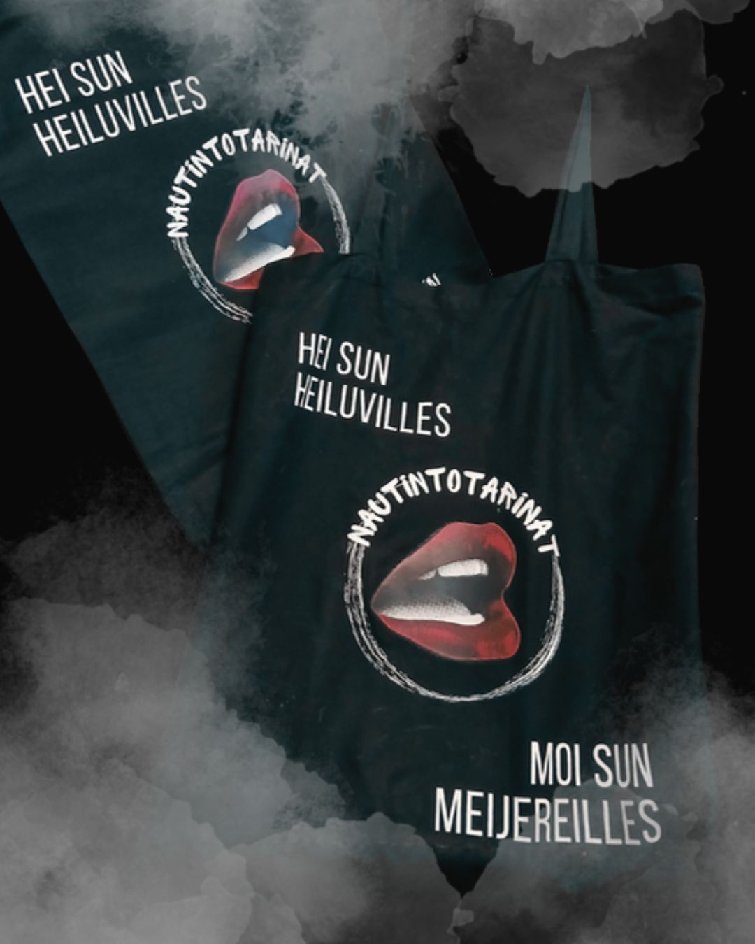 Hei sun heiluvilles ja moi sun meijereilles. Nautintotarinoiden tukituotteena logolla varustettu kassi.